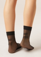 Женские прозрачные короткие носки с бортиком и надписью More Amore в тон. Плотность 15 ден. Этот изысканный женственный аксессуар придаст нотку стиля и индивидуальности вашему образу.