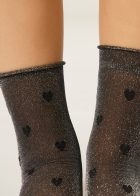 Женские прозрачные носки с блестками и мелкими сердечками. Плотность 20 ден. Верхняя часть собирается мягкими складками на щиколотке. Мягкий бортик с необработанным краем. Элегантные легкие носки, которые идеально подходят для стильного завершения женственного образа.