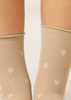 Женские прозрачные носки с блестками и мелкими сердечками. Плотность 20 ден. Верхняя часть собирается мягкими складками на щиколотке. Мягкий бортик с необработанным краем. Элегантные легкие носки, которые идеально подходят для стильного завершения женственного образа.