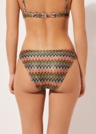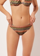 Слипы бикини на сплошной подкладке с невидимыми швами. Разноцветный волнистый узор — пестрое сочетание ярких оттенков — придает образу динамичность и идеально подходит для лета. Слегка закругленная линия талии позволяет носить эту модель как обычно или делать вырез бедра более высоким, подчеркивая стройность фигуры.
