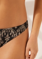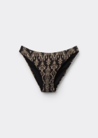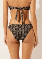 Слипы бикини на сплошной подкладке с невидимыми швами. Благодаря ткани с блестящими золотистыми узорами в этническом стиле на черном фоне, изделие выглядит модно и актуально. Слегка закругленная спереди линия талии позволяет регулировать посадку в зависимости от особенностей фигуры — купальник можно носить классическим способом или поднимать вырез бедра.