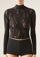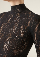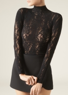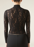 Топ из сетки с цветочным узором, напоминающим кружево макраме. Можно сочетать с колготками MODC2150. Элегантная модель с длинными рукавами и цельнокроенным воротником-стойкой.