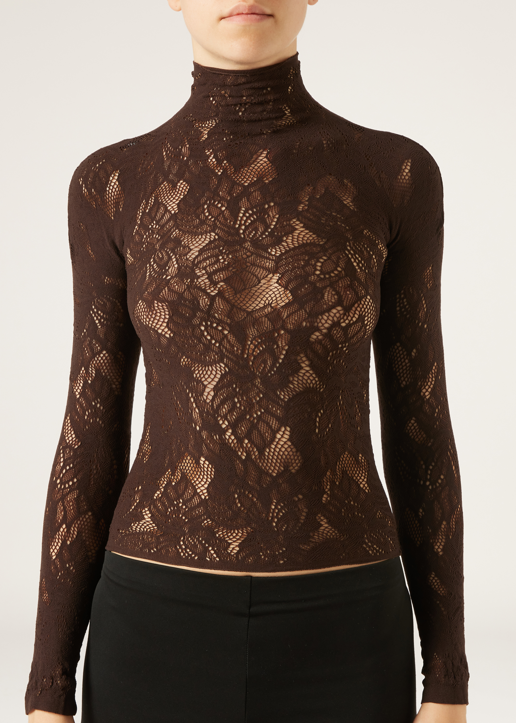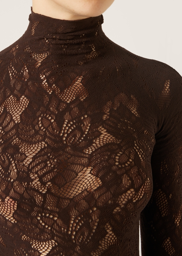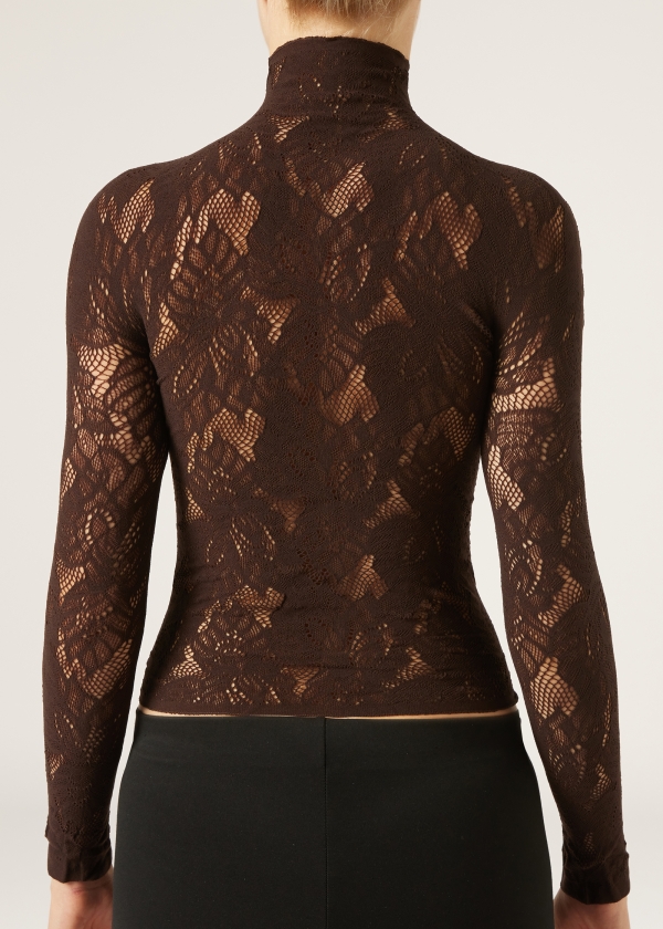 Кружевной топ в сеточку с цветочным узором. Идеально сочетается с колготками MODC2185. Эту изысканную модель с длинными рукавами и цельнокроенным воротником-стойкой можно носить в качестве нижнего слоя под жакетом для создания элегантного образа.