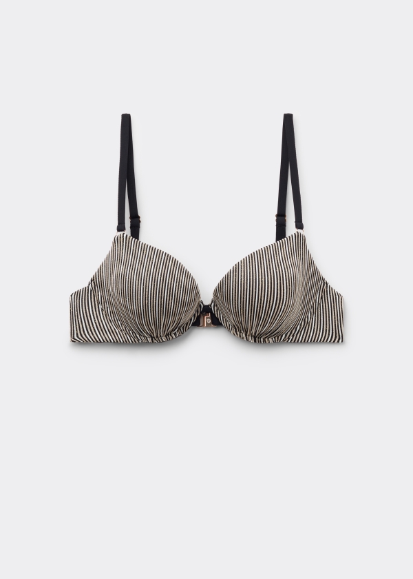 Верх купальника с эффектом пуш-ап. Чашки с легким уплотнением и косточками поддерживают грудь, придавая объем. Золотистый фон ткани придает этой модели в полоску изысканность и легкий блеск. Фиксированные бретели. Пояс с двойной регулировкой застегивается сзади на крючок.
