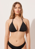 Верх купальника треугольник со скользящими чашками и съемными вкладышами. Благодаря отсутствию косточек грудь сохраняет естественный вид. Благодаря особой мягкости ткани изделие приятно прилегает к коже, создавая ощущение легкости и комфорта. Бретели с петлей на конце можно закрепить на поясе или завязать на шее. Тонкие завязки сзади.