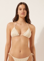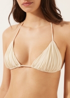 Верх купальника с треугольными чашками без косточек, со съемными вкладышами. Блестящая ткань с эффектом шелка. Драпировка. Завязки с золотистыми элементами на концах. Бретели с петлей на конце можно закрепить на поясе или завязать на шее. Тонкие завязки сзади.