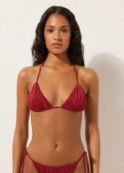 Верх купальника с треугольными чашками без косточек, со съемными вкладышами. Блестящая ткань с эффектом шелка. Драпировка. Завязки с золотистыми элементами на концах. Бретели с петлей на конце можно закрепить на поясе или завязать на шее. Тонкие завязки сзади.