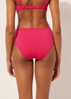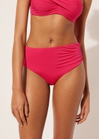 Плавки со слегка завышенной посадкой и драпировкой на боку. Вставка из тюля обеспечивает утягивающий эффект в области живота. Благодаря особой мягкости ткани изделие приятно прилегает к коже, создавая ощущение легкости и комфорта. Сплошная подкладка и невидимые швы.
